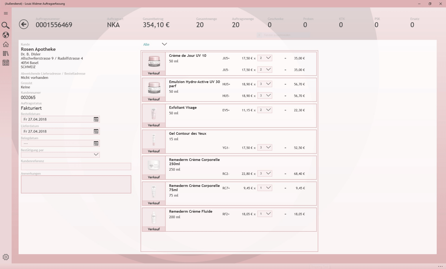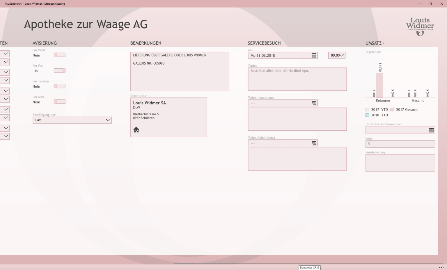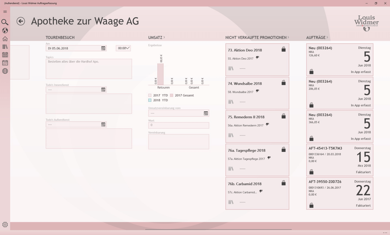 Diese ist speziell auf die Bedürfnisse der Vertriebsmitarbeiter bei Louis Widmer zugeschnitten und ermöglicht somit eine schnelle Erfassung von Aufträgen direkt vor Ort in der Apotheke. Außerdem bietet die Lösung einen schnellen Überblick auf vergangene Umsatzdaten, eine umfassende Besuchsdokumentation und Routenplanung.